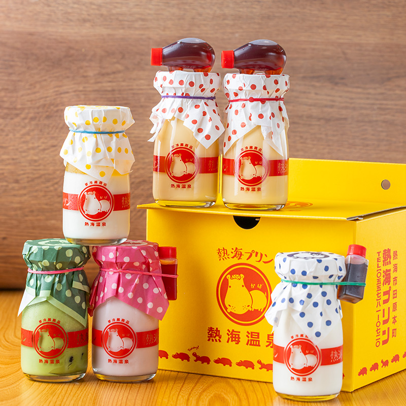 セット内容:熱海プリン特製カラメルシロップ付×2、いちごプリン、静岡抹茶プリン、風呂まーじゅだいだい、風呂まーじゅエスプレッソ